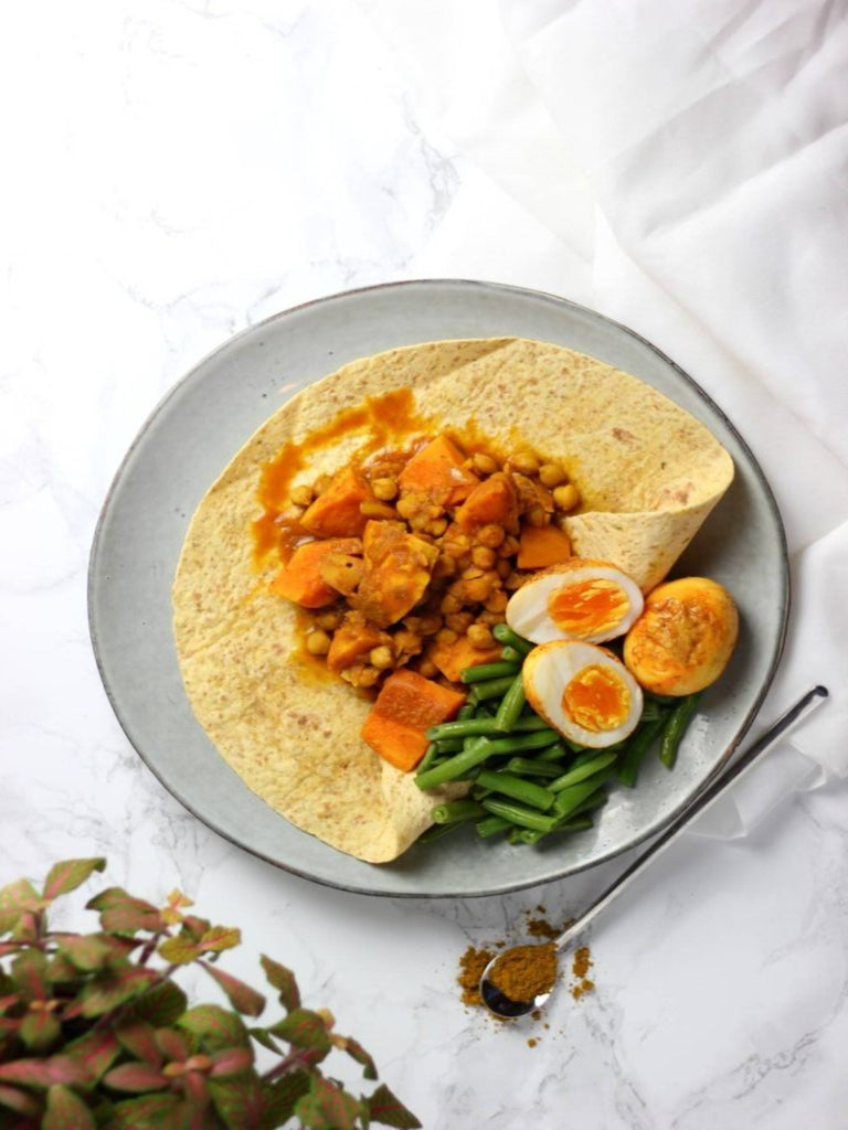 Surinaamse Roti met zoete aardappel, sperziebonen, wortel en kikkererwten